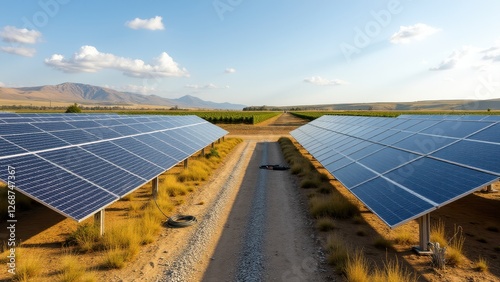 Cable tightening, Photorealistic solar farm managing power cables.