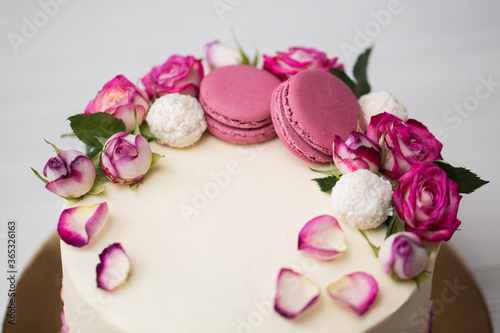 Cake with roses and macaroons