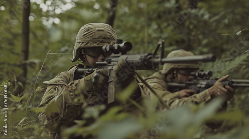 Camouflaged military special forces navigate the dense forest with stealth and precision, executing covert operations and demonstrating their expertise in challenging woodland environments.
