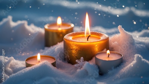 Candles glow warmly on snowflakes lying in the snow, capturing the wonder and magic of winter's fragile art.