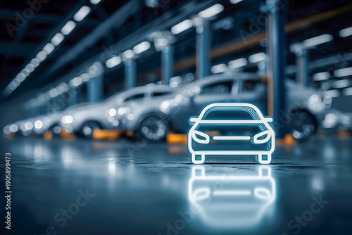 Car lift platform in focus with blurred mechanic silhouettes in modern garage bay