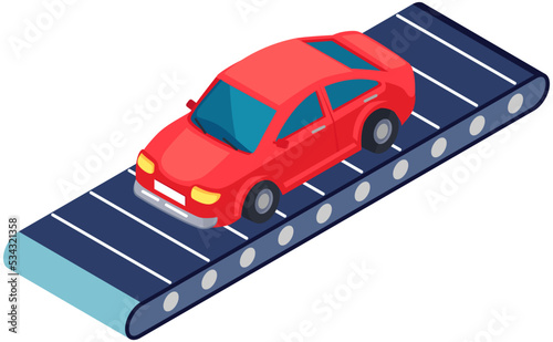 Car production factory equipment. Automotive construction of vehicles. Red automobile on conveyor plant. Vehicle speed check. Transport on moving belt. Industrial technology for manufacturing