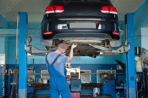 Car service. Mechanic repairing chassis of the car