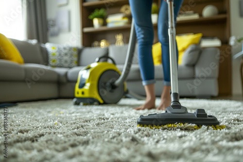 Carpet cleaning, long pile, fluffy doormat, dirty rug. Woman hoovering carpet in living room. Cleaning service