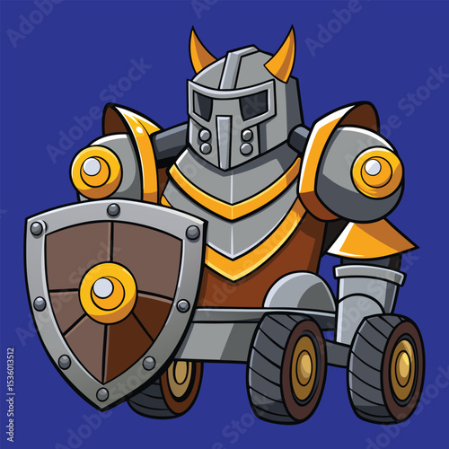 Cartoon Armored Knight on Wheels Character Holding Shield Illustration with Blue Background