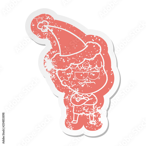 cartoon distressed sticker of an annoyed man wearing santa hat