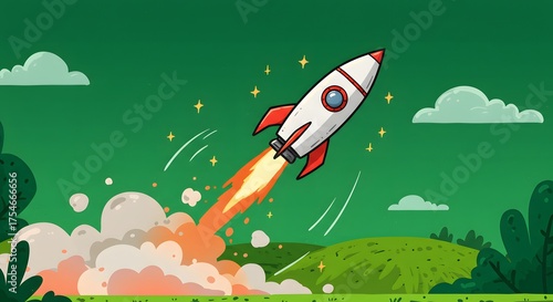 Cartoon illustration of a rocket blasting off, leaving smoke, and rising into a green sky