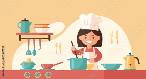 Cartoon Illustration of a Smiling Female Chef Cooking in a Warm and Inviting Kitchen