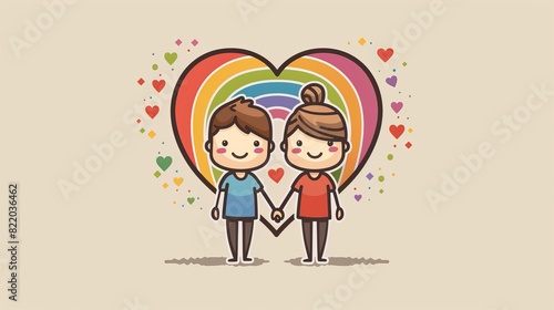 Cartoon vector 2D illustration of a minimalistic LGBTQ couple holding hands with a rainbow heart in the background Generative AI