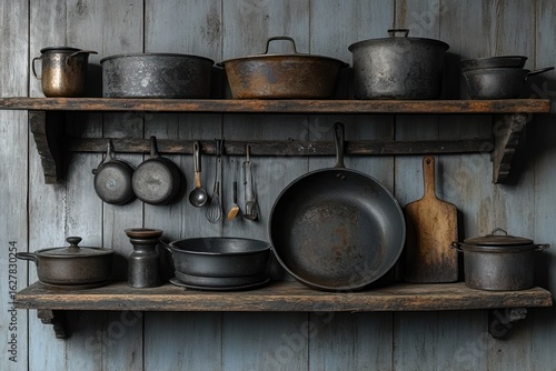 Cast iron pans and cooking tools displayed on rustic kitchen shelf
