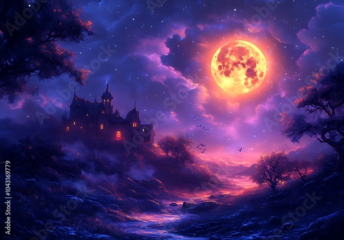 Castle on a Hill with a Full Moon in the Sky