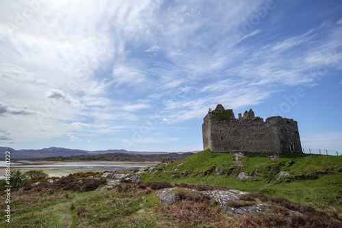 Castle Tioram stands atop a hill overlooking the serene waters and lush landscape of Scotland under a vibrant sky