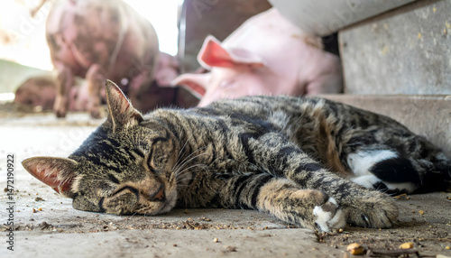 Cat sleeps near pigs indoor with concrete floor relaxing together serene scene