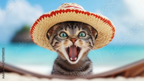 Cat wearing a sombrero is standing on a beach. The cat is making a loud noise and he is excited