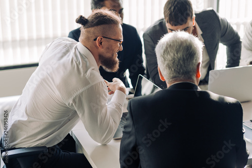 Caucasian businessman sharing ideas on project with his multi-ethnic co-workers in conference room, emotional, positive and focused on his speech man voicing his point of view, close up
