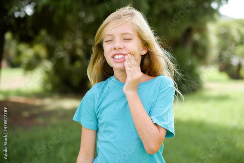 Caucasian little kid girl wearing blue T-shirt standing outdoors touching mouth with hand with painful expression because of toothache or dental illness on teeth.