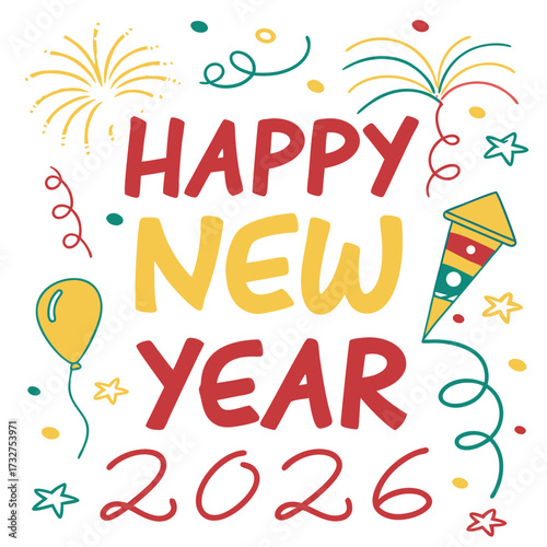 Celebrate a vibrant and festive Happy New Year 2026 with fireworks, balloons, and confetti, perfect for joyful occasions