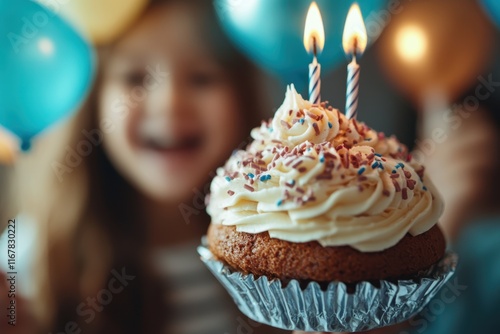 Celebrating a special day with laughter, balloons, and a delicious cupcake topped with candles