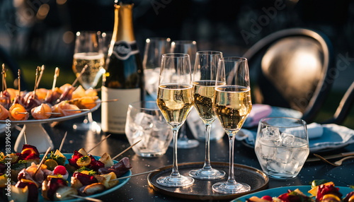 Celebratory champagne toast on a luxurious outdoor dining table with assorted appetizers and finger foods in an elegant evening setting