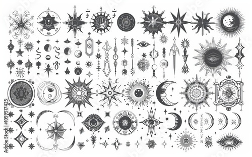 Celestial mystic esoteric magic elements: moon, clouds and phases of the moon. Template for Alchemy tattoo object logo.