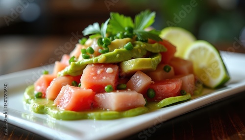 Ceviche salad with chunks of raw fish, avocado, and lime dressing, served on rectangular plate