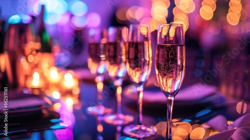 Champagne glasses on table at festive event with colorful bokeh lights in background