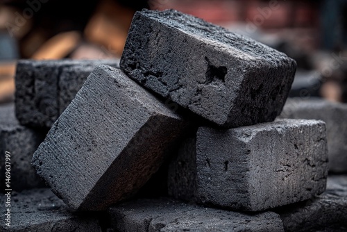 Charcoal blocks are stacked haphazardly at a construction site, showcasing their dark texture and geometric shapes in the warm afternoon light, with raw materials in the background