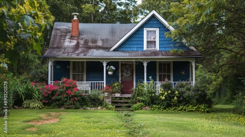 Charming Blue Cottage Amidst Lush Greenery