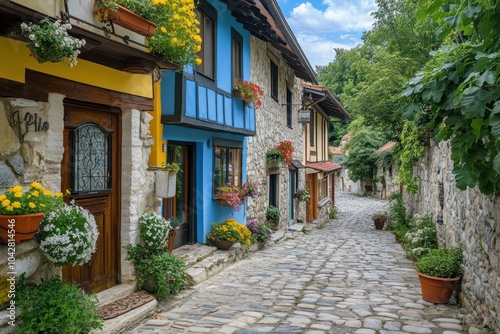 Charming cobblestone street lined with colorful houses and vibrant flowers.