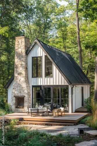 Charming modern cabin surrounded by lush forest in the early morning light, showcasing a unique blend of stone and wood architecture with spacious outdoor deck