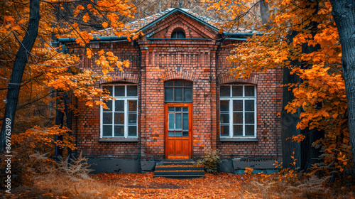 Charming old brick house surrounded by vibrant autumn foliage in a serene forest setting, showcasing fall's natural beauty.