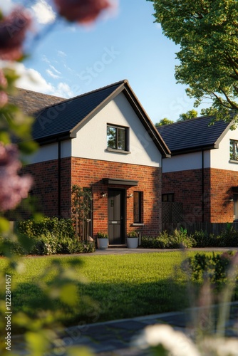 Charming residential home surrounded by lush greenery and blooming flowers in a tranquil neighborhood during the late afternoon light