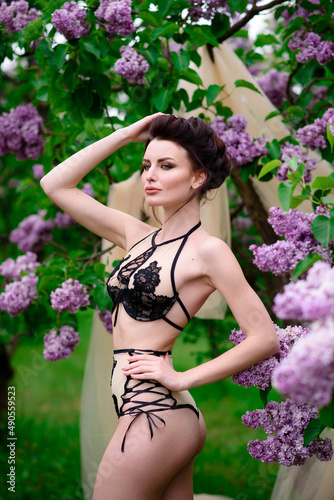 Charming sexy young girl with sportive body in trendy swimsuit posing in green summer garden