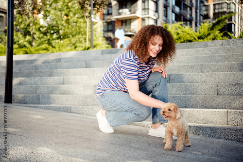 Charming young woman with curly brown hair and stylish t-shirt enjoys a sunny day outdoors, bonding with a cute dog