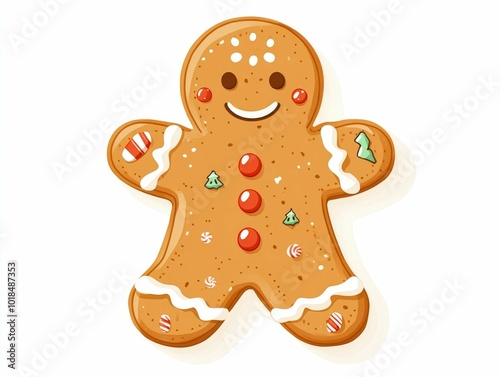 Cheerful smiling gingerbread man cookie with festive holiday design elements like sprinkles icing and a warm cozy color palette Isolated on a plain white background for a clean