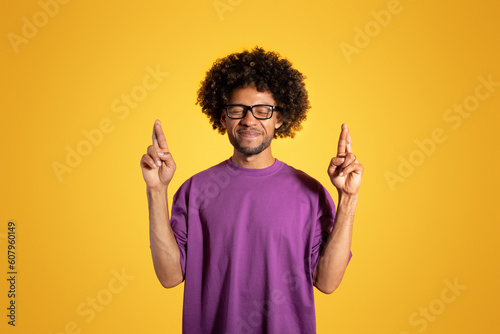 Cheerful calm mature black curly man in purple t-shirt and glasses crossed fingers gesture