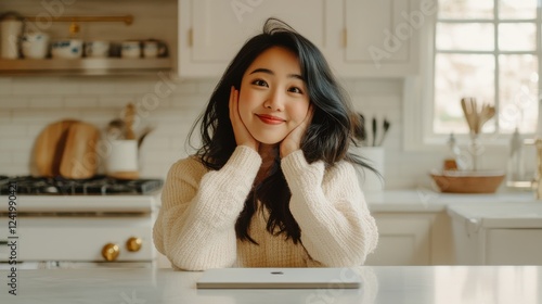 Cheerful Woman in Cozy Sweater Sitting at Kitchen Table with Laptop
