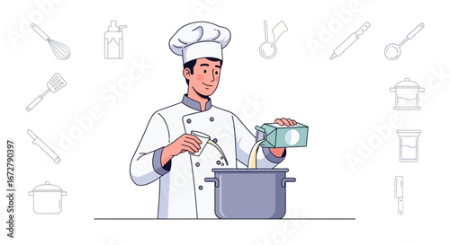 Chef Cooking Food Preparation In Kitchen With Cooking Utensils Elements