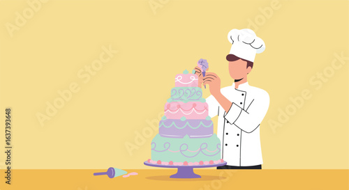 Chef is decorating a tiered cake with icing, on yellow background