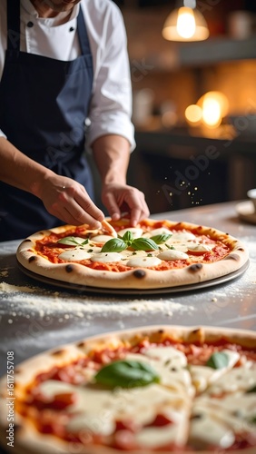 Chef topping pizza with fresh basil