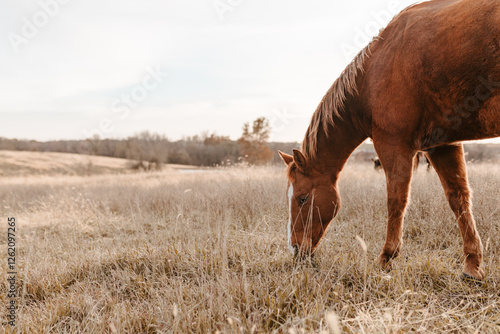 Chestnut brown horse grazing in a grassy field under soft daylight.