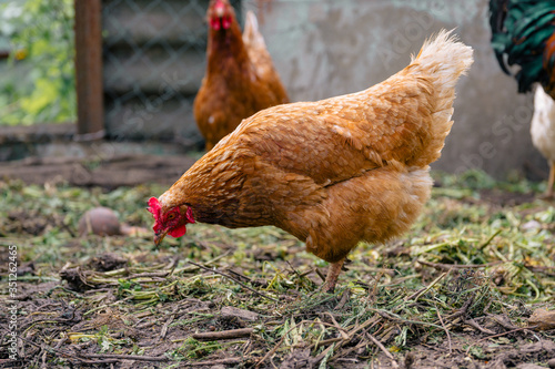 Chicken walking in paddock. Chicken looking for grains while walking in paddock on farm