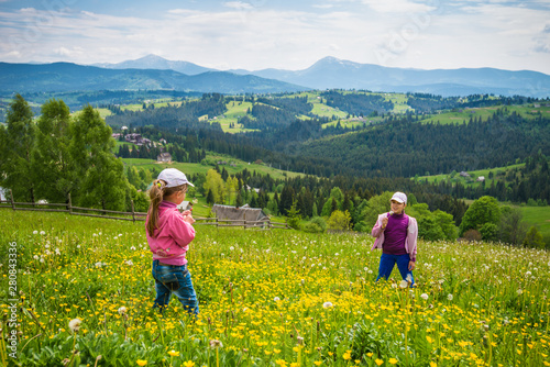Children walking in the flowering meadow