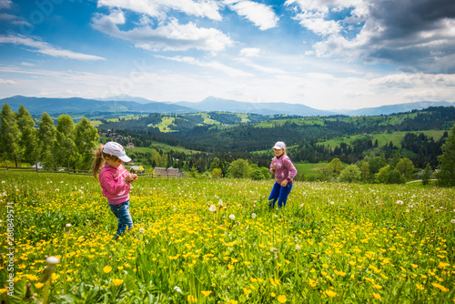 Children walking in the flowering meadow