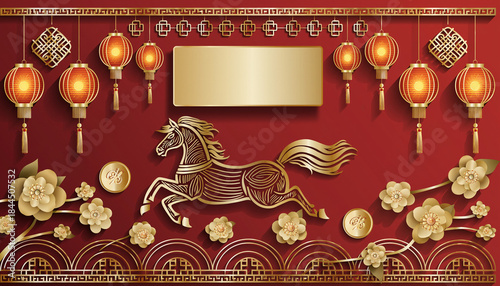 Chinese New Year 2026 Vector Design with Gold Running Horse and Lanterns