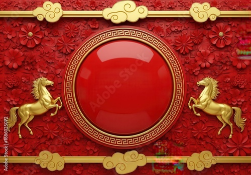 Chinese New Year Background Red and Gold Horse, Clouds, Floral Ornament