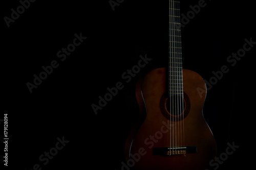 Chitarra classica su fondo nero con riflessi di luce