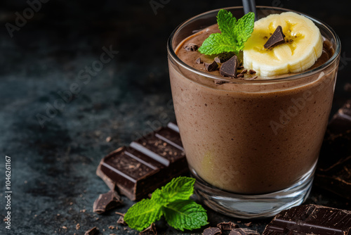 Chocolate banana smoothie with mint garnish in a glass on a dark background