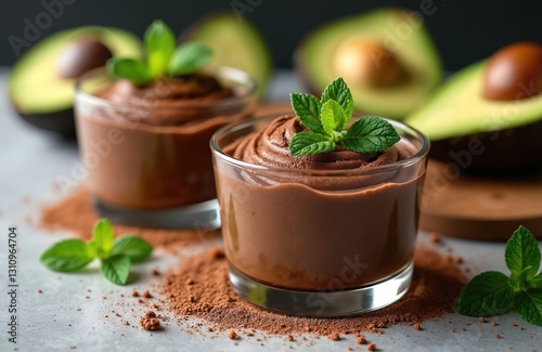 Chocolate mousse dessert with avocado, mint. Refreshing dessert combines rich chocolate flavor with avocado notes, aromatic mint. Vegan healthy treat. Culinary photography, homemade chocolate parfait