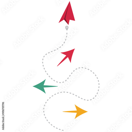 Choosing a right path to move forward. Business decision making and the way to success. Paper plane with arrows pointing three different directions